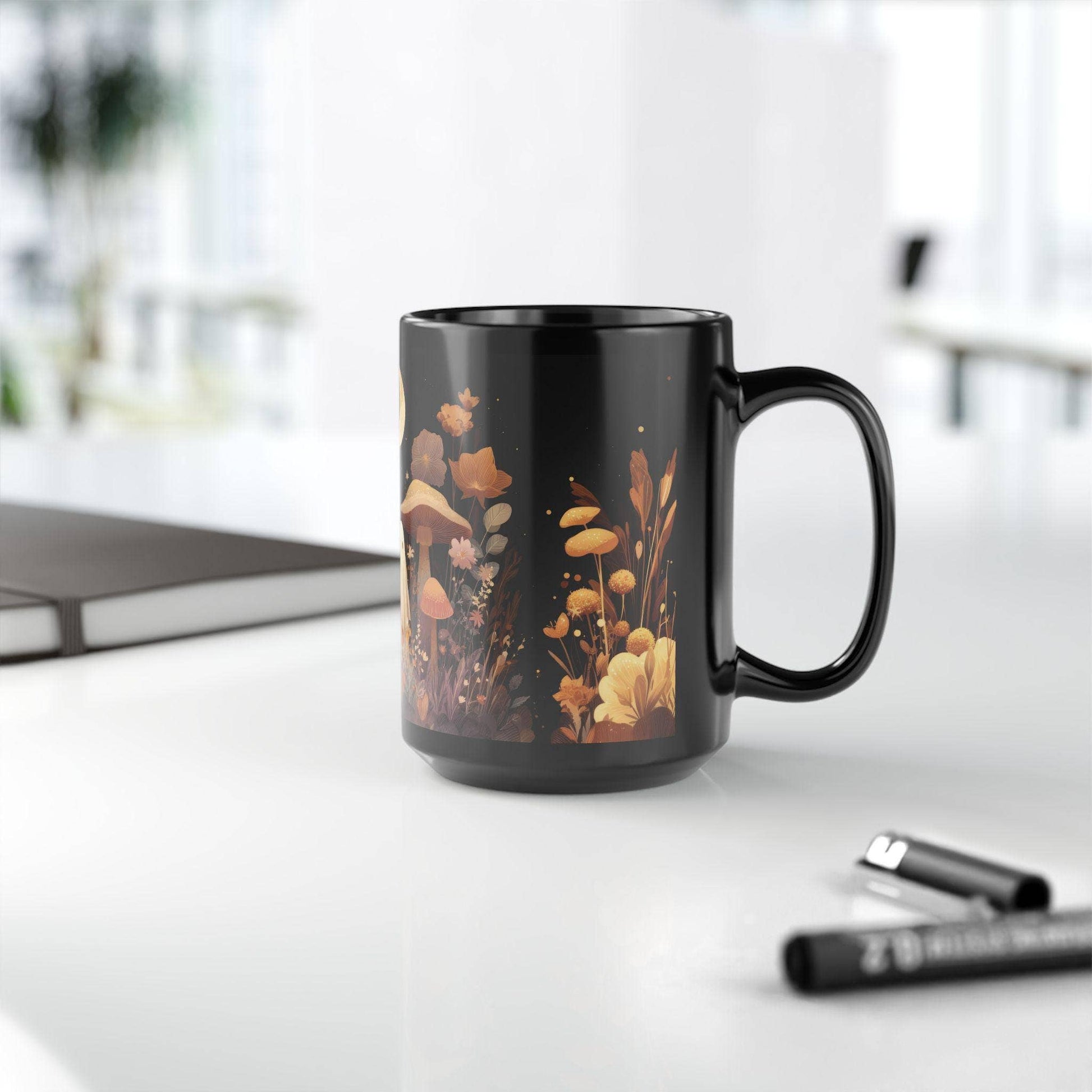 11oz black ceramic mug featuring sweet ghosts in a lush mushroom landscape